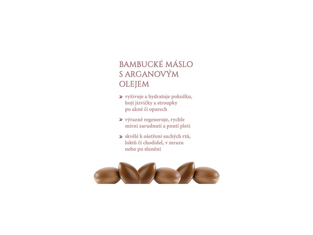 BAMBUCKÉ MÁSLO S BIOARGANOVÝM OLEJEM A VITAMINEM E 25 MLSpojení 100% přírodního marockého za studena lisovaného arganového oleje, bambuckého másla a vitaminu E v nejvyšší kvalitě přináší pleti komfortní ošetření. Arganový olej pomáhá k obnově pokožky, aby byla vláčná, hebká a vypnutá, jemné bambucké máslo hydratuje, vyživuje a hojí drobné defekty a poranění, vitamin E redukuje poškození struktury kůže a dodává jí pružnost. Jedinečný přípravek poskytuje pokožce rychlou regeneraci a skvělou ochranu před nepříznivými vlivy okolí.