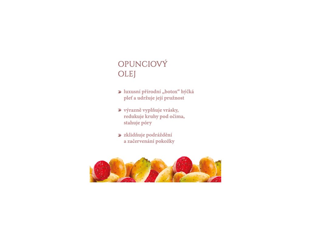 Pro známé omlazující účinky opunciového oleje se o něm hovoří jako o přírodním botoxu nebo elixíru mládí. Je vydatným zdrojem minerálních látek, vitamínů, mastných kyselin a aminokyselin. Má skvělé regenerační vlastnosti, viditelně vyhlazuje vrásky, redukuje kruhy pod očima, vyživuje pokožku, stahuje póry. Pleť je při pravidelném používání pružnější a pevnější. Exkluzivní olej ocení jako omlazující sérum zejména pleť suchá a zralá. Lehce se vstřebává, má příjemnou vůni a nezanechává pocit mastnoty. Přípravek je vhodný zejména pro ošetření citlivých očních partií, krku a dekoltu. Pomáhá při zklidnění podrážděné a začervenalé pokožky, mírní nepříjemné projevy nadměrného opalování.