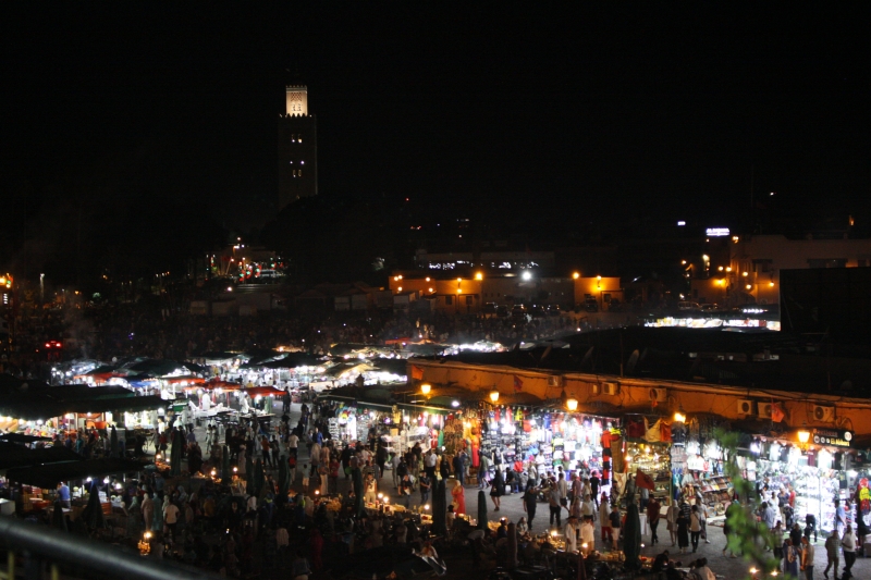 Zbytek dne byl zcela turistický - podívali jsme se na největší mešitu Marakéše - Kutúbija má 64 m a je zkrátka nádherná! Prošli jsme se pak na náměstí mrtvých (Jemma el-Fnaa), dali si tajine a pak se toulali po krámcích a nasávali atmosféru. Zastavovali jsme se různě na čaj a čekali na setmění, kdy se celé náměstí promění v jednu velkou jídelnu a mumraj všemožných lidí. Upřímně - i toto Vám může zabrat celý den a v uličkách okolo náměstí se toulá příjemně (navíc tam není takové horko). Každopádně se nebojte s obchodníky smlouvat! Je to zábava a turistům zkoušejí dát různé ceny. Pár arabských slovíček uvolní atmosféru a Vy se tak budete cítit mnohem lépe.