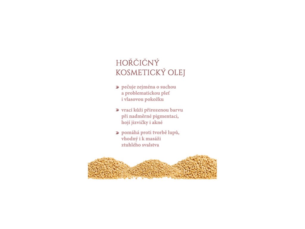 HOŘČIČNÝ OLEJOlej vylisovaný ze semínek hořčice má dlouhou tradici v exotických zemích díky vysokému obsahu vitaminů A, K, P, E, B6 a antibakteriálním vlastnostem. Ať už jako součást stravy či kosmetické péče. Pokožku umí vyčistit i rozjasnit, pomáhá jí navrátit přirozenou barvu při nadměrné pigmentaci, hojit jizvičky a pupínky. Při zátěži uleví namáhaným svalům - ideální pro masáž ztuhlého svalstva.