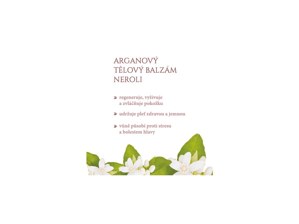 ARGANOVÝ BALZÁM NEROLIJemný balzám pro péči o celé tělo. Hlavní složkou výrobku je za studena lisovaný arganový olej (o jeho výrobě se dočtete více v tomto článku), který díky svým vlastnostem pokožku zvláčňuje a zanechává ji na dlouhou dobu jemnou.